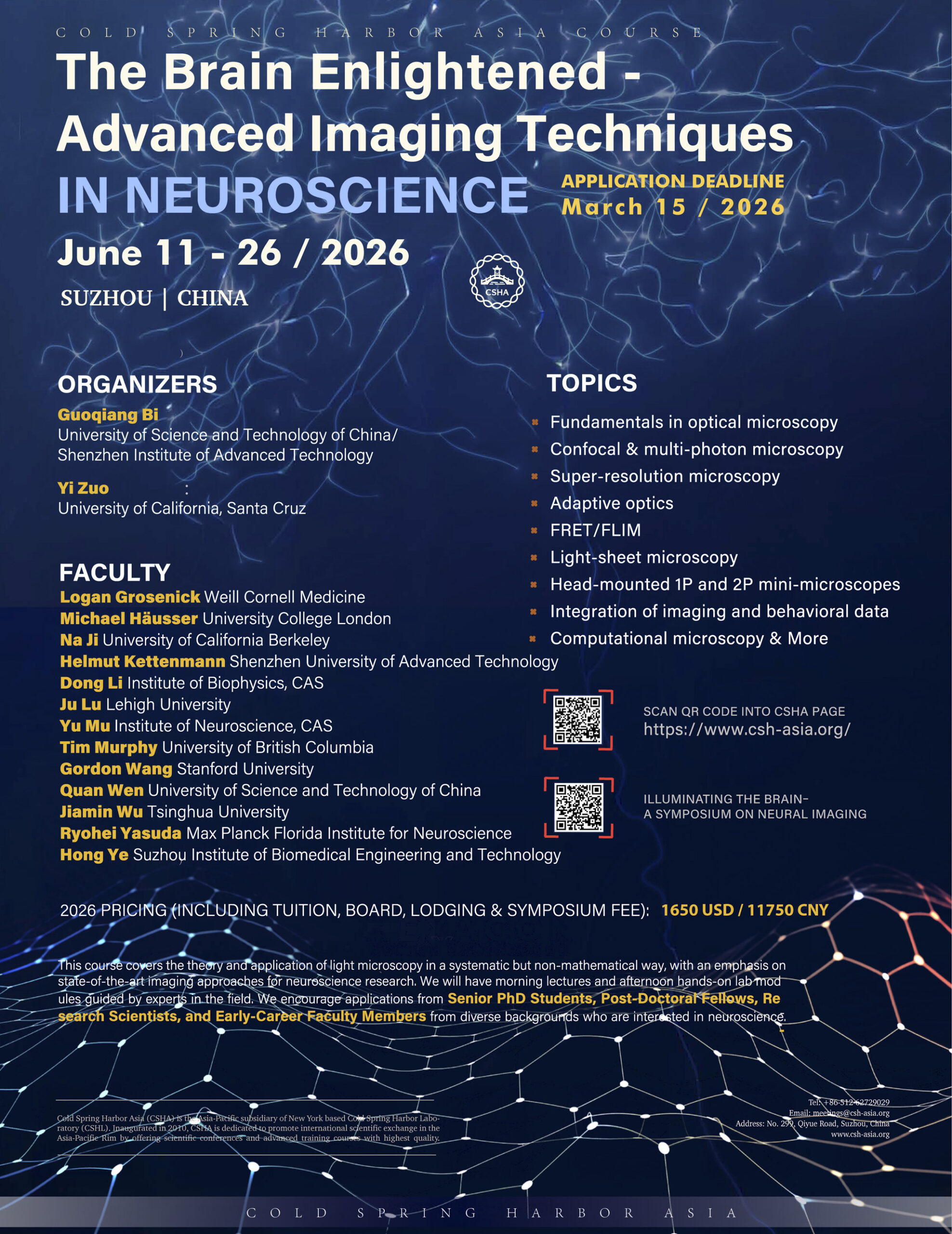 This course covers the theory and application of light microscopy in a systematic but non-mathematical way, with an emphasis on state-of-the-art imaging approaches for neuroscience research. We will have morning lectures and afternoon hands-on lab modules guided by experts in the field. We encourage applications from senior PhD students, post-doctoral fellows, research scientists, and early-career faculty members from diverse backgrounds who are interested in neuroscience.